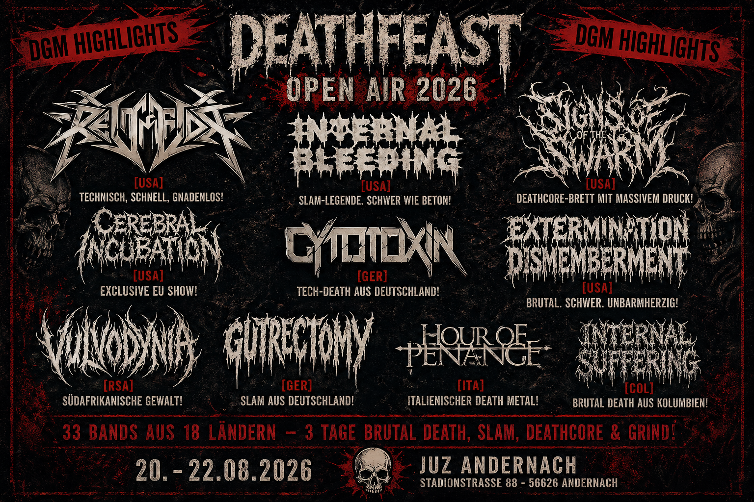 2026 wird das Deathfeast laut Veranstalter mit 33 Bands aus 18 Ländern an den Start gehen. Das ist schon eine Ansage. Vor allem, weil das Billing nicht einfach nur aus den üblichen Namen besteht, sondern ordentlich international aufgestellt ist. USA, Kolumbien, Indonesien, Taiwan, Südafrika, Belgien, Frankreich, Tschechien, Deutschland und noch einige mehr. Da wurde wirklich einmal quer durch die Brutal-Death-Landkarte geprügelt.