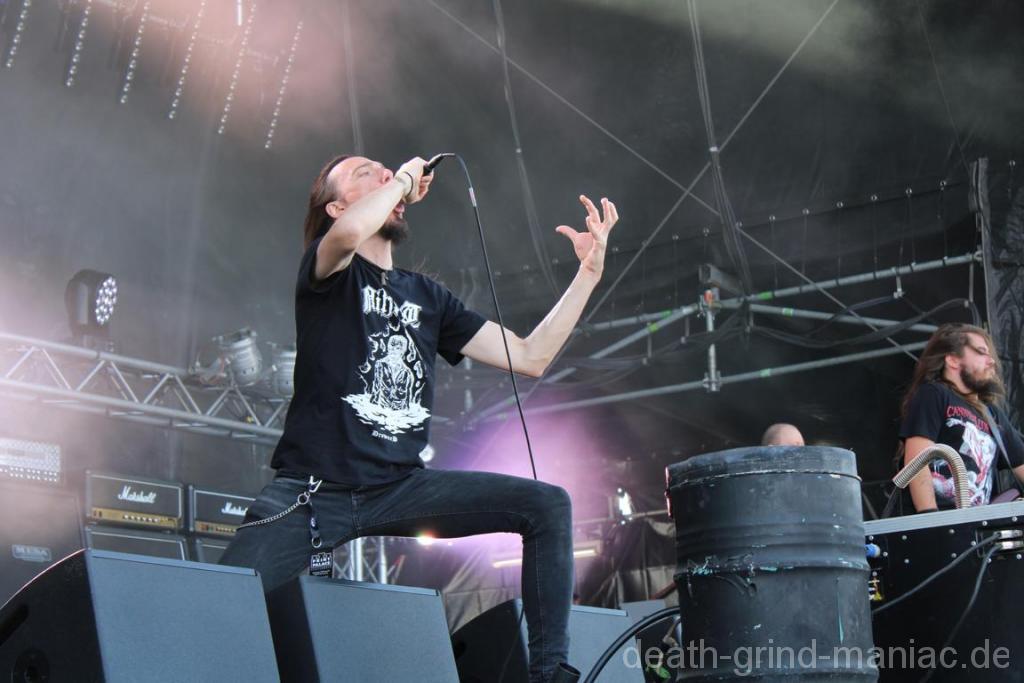 Kurz vor 12Uhr am Freitagmorgen, wir sind, auf dem Festivalground, zum Spazieren gehen verabredet. Cuba zum Frühstück und „nebenbei“ spielen Kadaverficker! Die asozialen Dortmunder spielten das erste Mal auf so einer großen Bühne und man darf auch nicht verkennen, am Freitagmittag möchte der Pöbel Grind ins Gesicht! Die Erwartungen sind hoch und die Ficker liefern, als ob es total normal ist! Backdrop hängt, Band spielt, der Goreminister erzählt und die Menge feiert es! Bis zu diesem einem Moment, als die klare Ansage an die braune Sippschaft ging. Leider gingen da ein paar mehrere Hände in die Tiefe und sie bekamen zu Recht ein klangvolles Stuhlgewitter um die Ohren! Klasse Auftritt!
