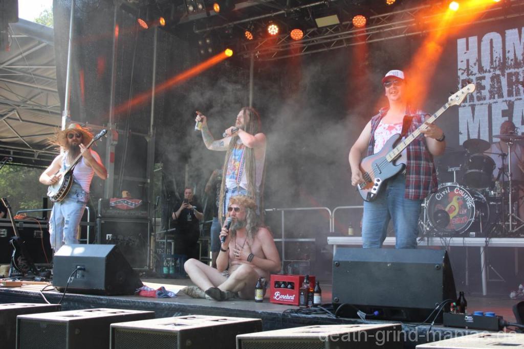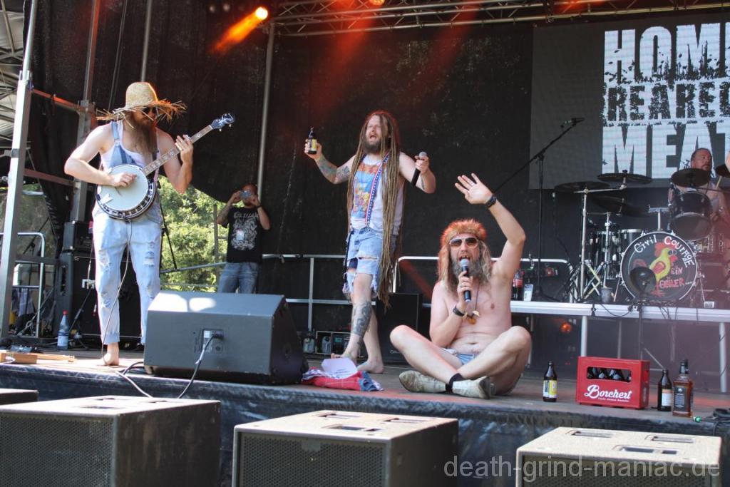Mit ähnlicher Musik ging es nicht weiter, jetzt kamen Home Reared Meat und belästigten die Gäste 😉 Es versammelten sich tatsächlich ein paar Menschen dichter an der Bühne, aber Bewegung kam nicht dazu. Wie man die Jungs kennt spielten sie voller Elan und mit viel Bock. Hill Billy Slam geht halt immer, erstrecht mir der Combo!