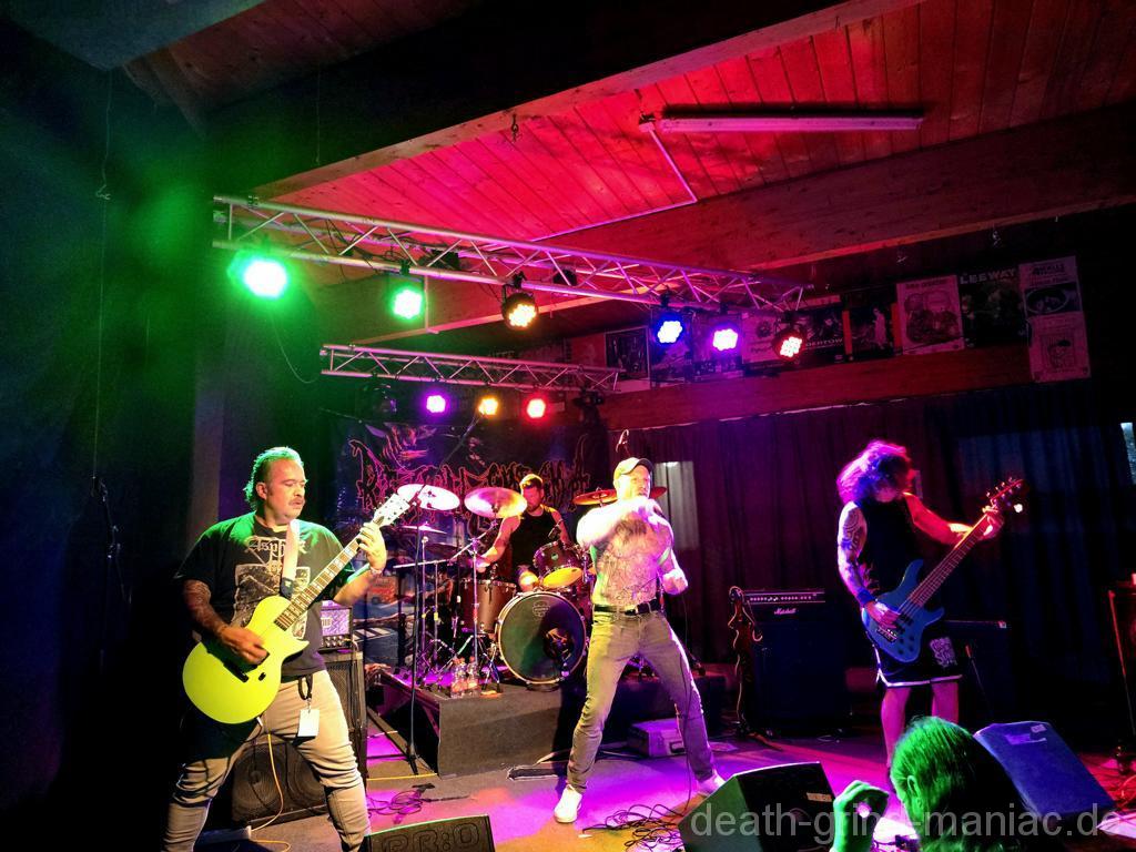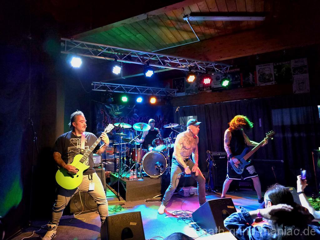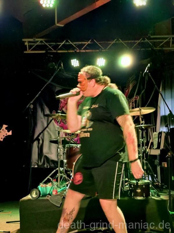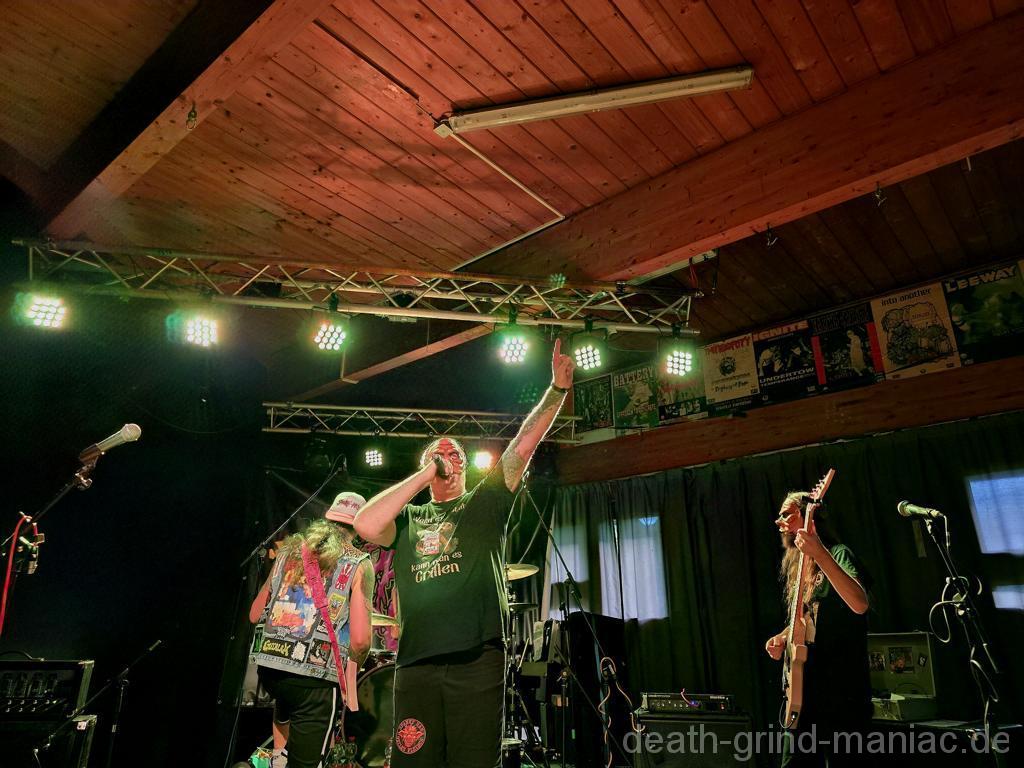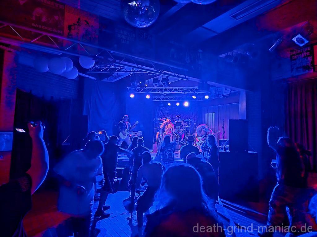 Den Opener machten niemand Geringeres als Deep Dirty selbst. Stefan, einer der Veranstalter, legte mit seiner Truppe los, als gäb’s kein Morgen. Der Saal war sofort auf Betriebstemperatur – Circle Pits, fliegende Haare, und der Mischer schob direkt alles auf Anschlag. So muss Grindcore-Start sein: laut, wild und direkt in die Fresse!